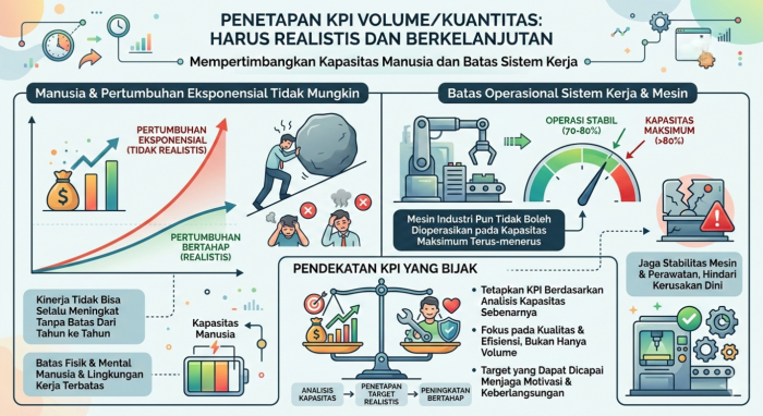 Penentuan KPI berbasis kuantitas atau volume pekerjaan harus dilakukan dengan mempertimbangkan batas kapasitas manusia dan sistem kerja. Asumsi bahwa kinerja harus selalu meningkat dari tahun ke tahun adalah pendekatan yang tidak realistis karena manusia tidak dapat bekerja dengan pola pertumbuhan eksponensial tanpa batas. Bahkan dalam dunia industri, mesin yang dirancang untuk bekerja secara mekanis pun tidak boleh dioperasikan pada kapasitas maksimumnya secara terus-menerus melainkan dibatasi sekitar 70 – 80% dari kapasitas desainnya demi menjaga stabilitas mesin.